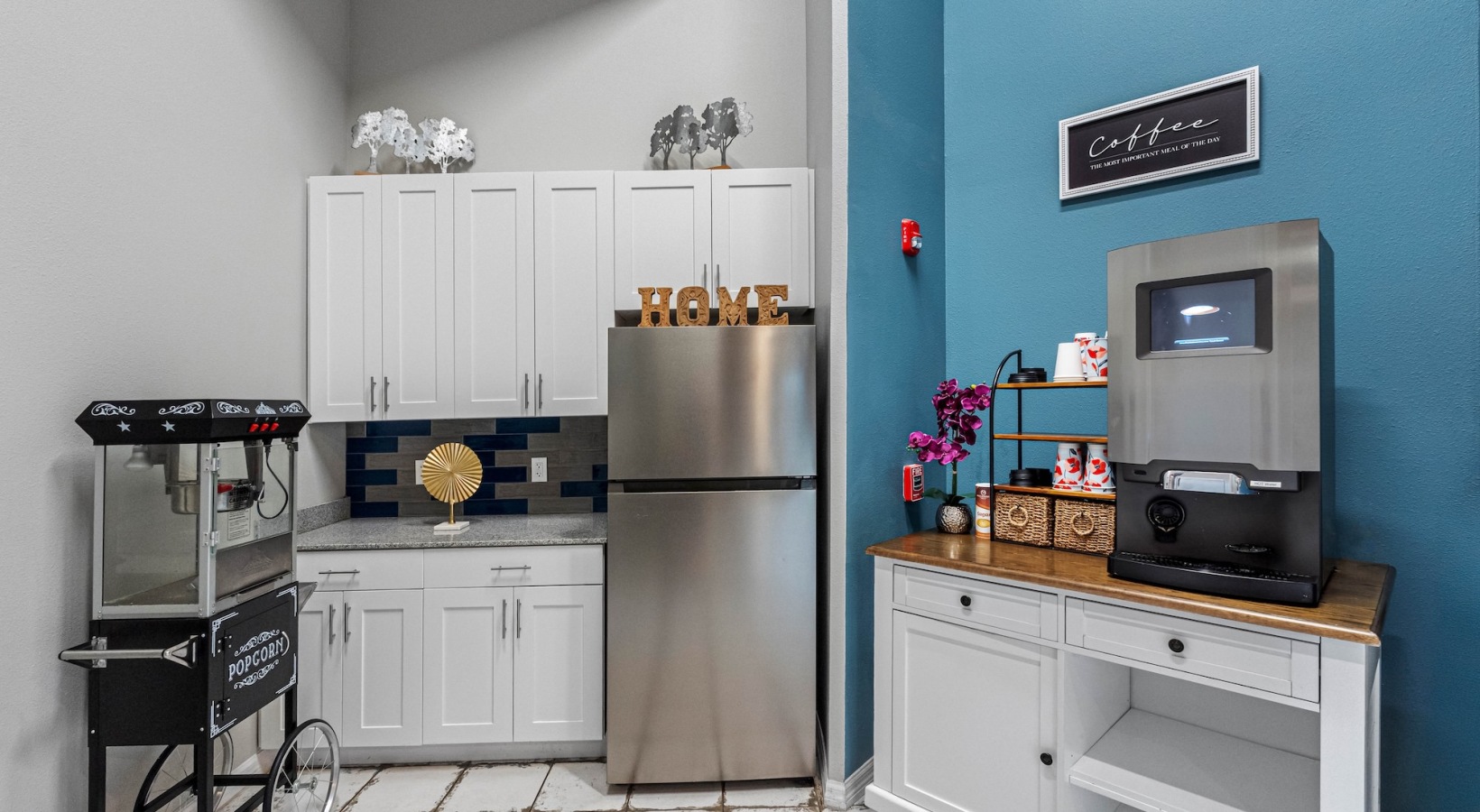• a commuity kitchen with a fridge popcorn machine and coffee machine